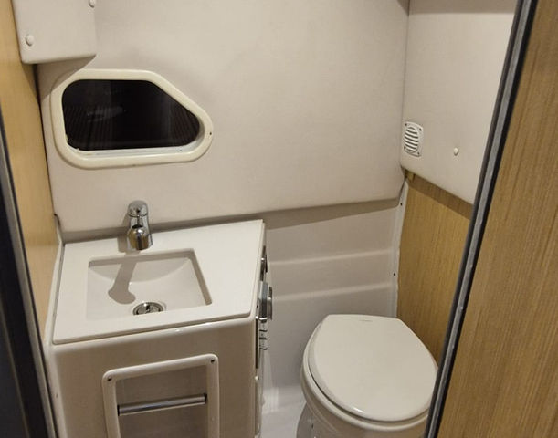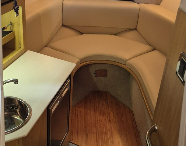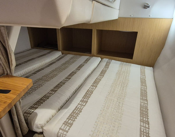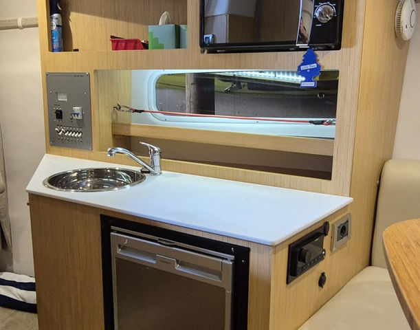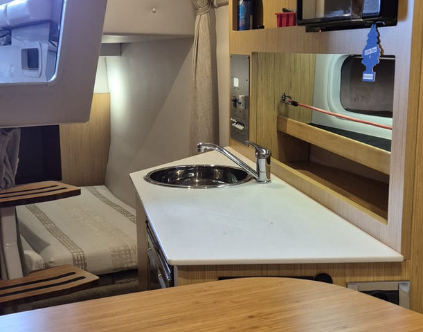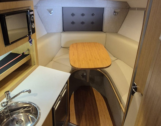 Inside, the cabin is thoughtfully laid out with modern amenities. It includes a V-berth that converts into a cozy sleeping area.
