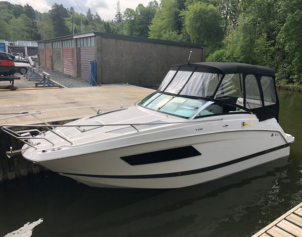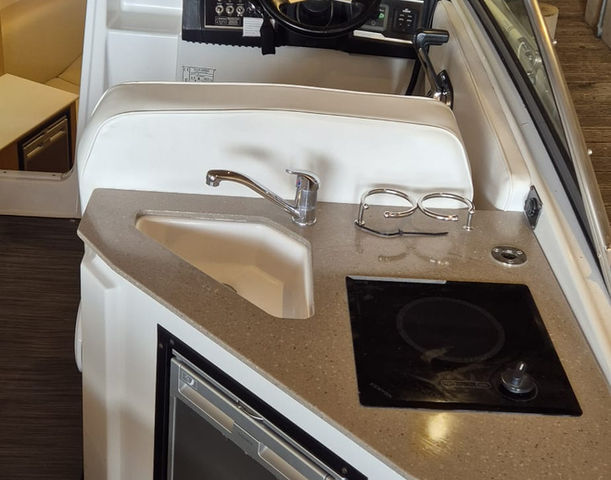 The Vista 255 features a spacious cockpit with ample seating, a wet bar, and an integrated swim platform, making it ideal for social gatherings and water activities.